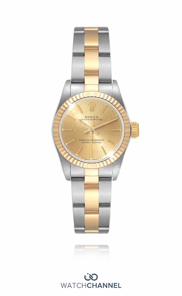The Rolex Oyster Perpetual ref. 67193 is a classic two-tone Rolex ladiesโ watch from the mid-1990s, blending timeless elegance with everyday reliability. Its compact 26 mm Oyster case in stainless steel and 18 ct yellow gold (also called Yellow Rolesor) houses a warm champagne dial, complemented by an 18 ct yellow gold fluted bezel โ a signature Rolex design cue that adds visual depth and luxury. Powered by Rolexโs automatic Calibre 2130 self-winding movement, it delivers dependable precision and ease of use. The integrated Oyster bracelet in steel and yellow gold with a folding clasp completes the look, making this reference an enduring choice for those who appreciate understated luxury with classic Rolex heritage.